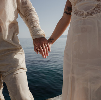 Their ceremony took place at Sarakiniko Beach, Milos... the dreamiest spot for an elopement! I created a bespoke ceremony script for them, which took them on a trip down memory lane. We decided to hold their personal vows within a circle of stones, which I collected from a few beaches around the island. The circle became a sacred space just for them – a place to make their promises and exchange their rings.
